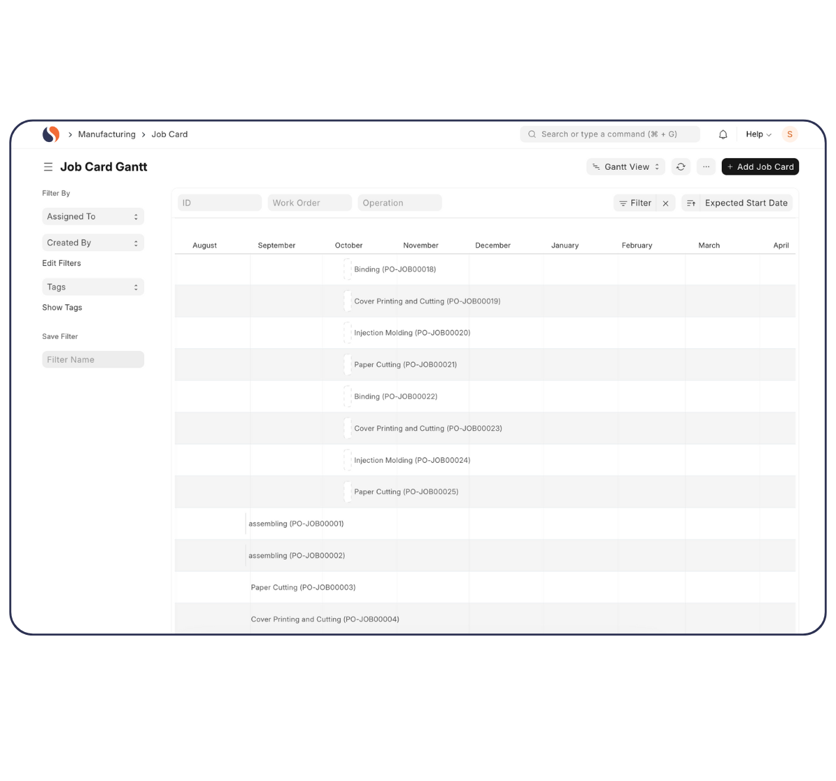 Monitor job card status, accepted/rejected quantities, and resource utilization live from mobile, supported by job status dashboards (Not Started, Overdue, Pending, Completed).